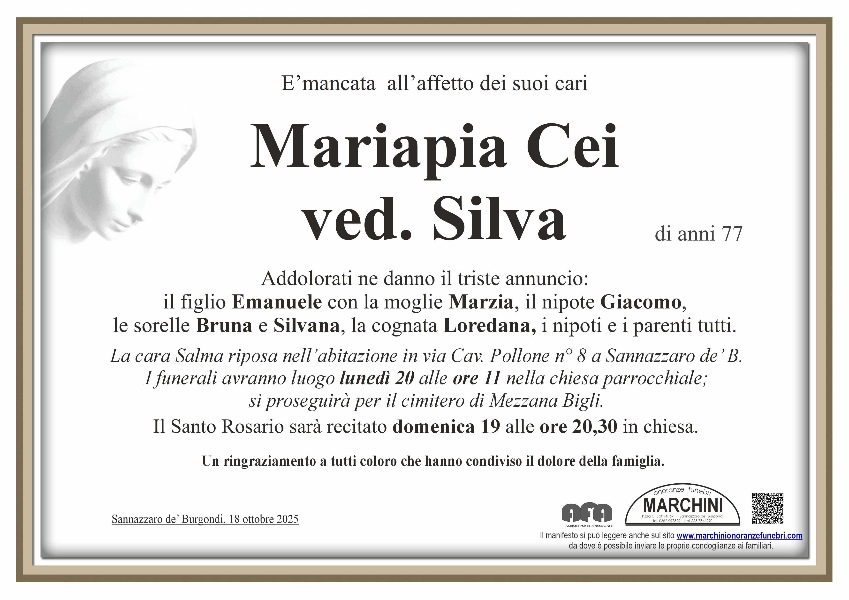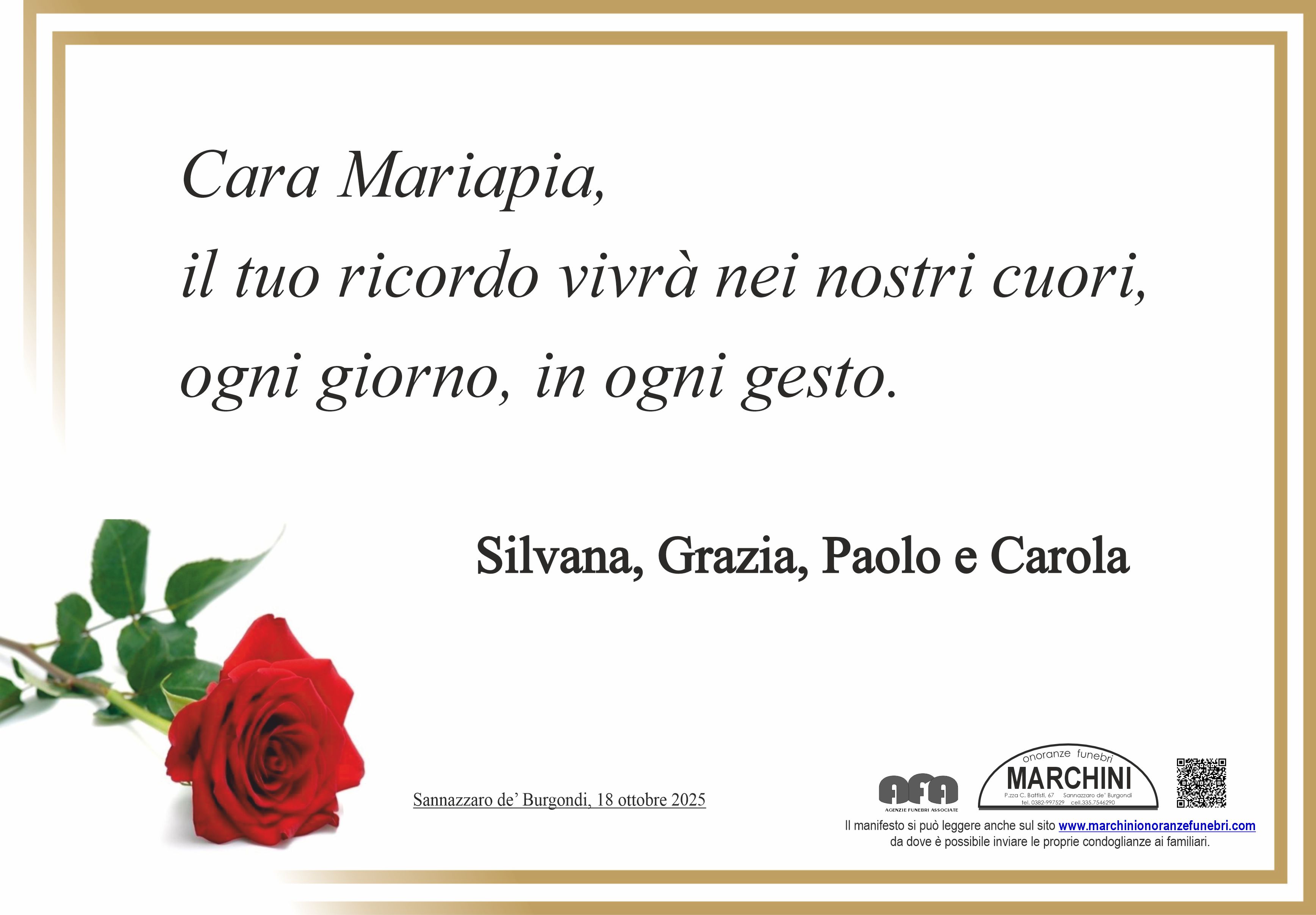 Profondamente addolorate partecipiamo commosse al vostro dolore e porgiamo le nostre più sincere condoglianze l, elevando al Signore una preghiera per Mariapia e per tutti voi affinché possiate trovare sostegno, conforto e consolazione in questo momento di immenso dolore. Pinuccia e Gabriella Sacchi